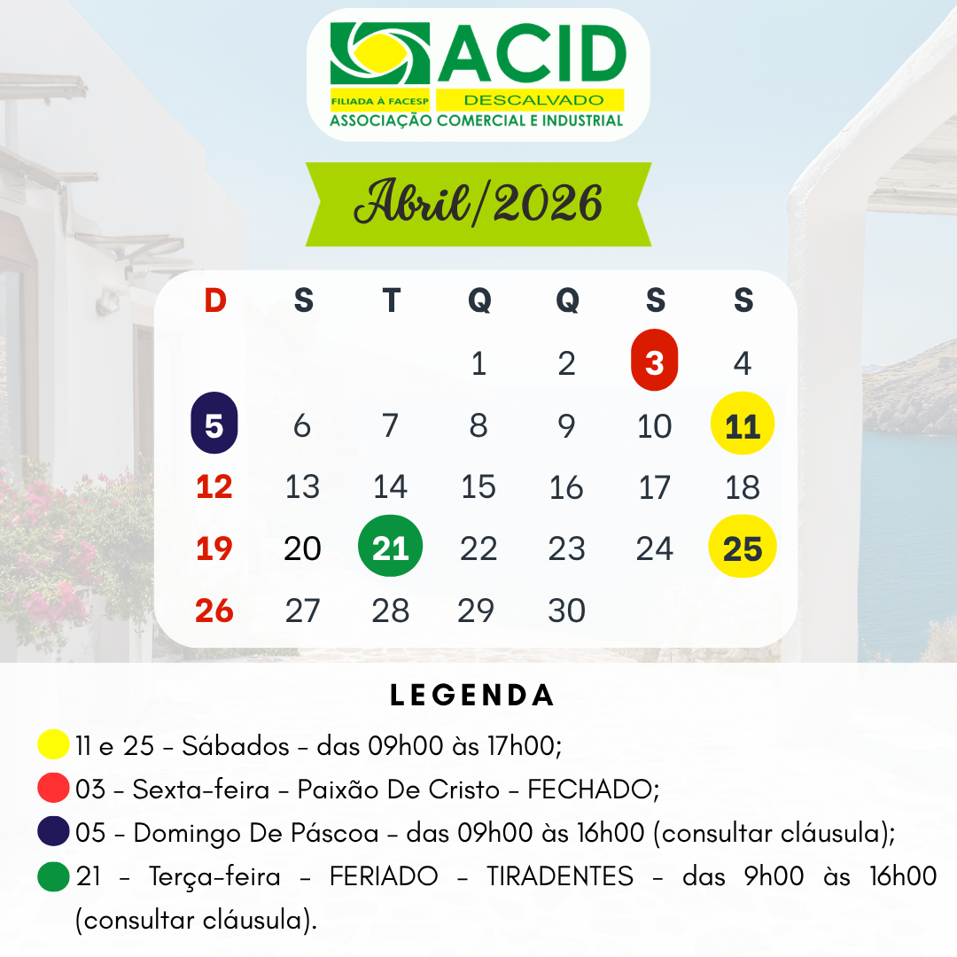 Horário do Comércio Conforme convenção coletiva junto ao sindicato, fica estabelecida os seguintes horários para ABRIL de 2026 Os horários apresentados não representam que cada estabelecimento seguirá o mesmo.