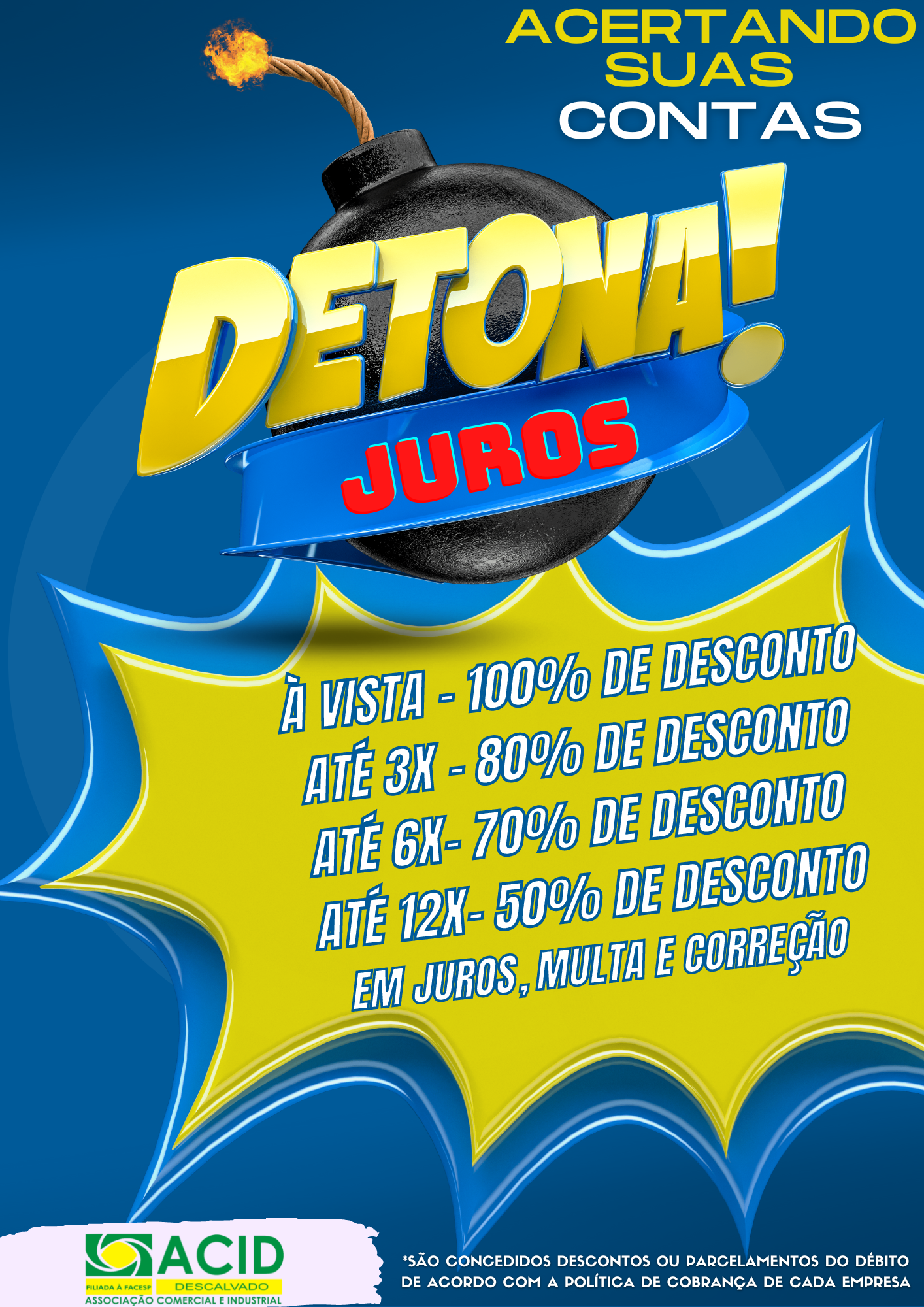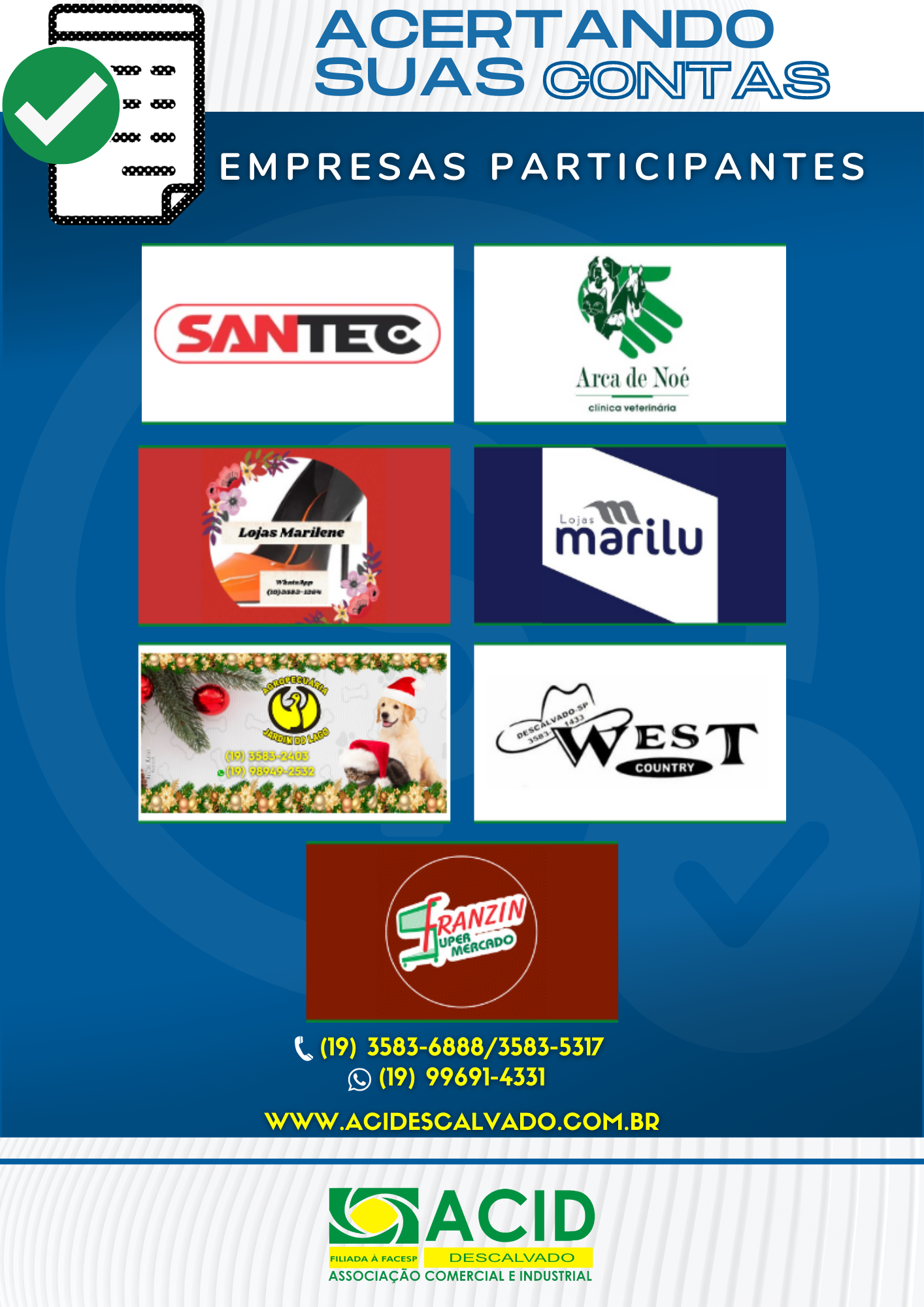 A ACID lança a Campanha Acertando Suas Contas 2022 que disponibiliza descontos de até 100% em juros, multa e correção para regularização de dívidas de pessoas físicas. Estão contempladas na ação as empresas: Agropecuária Jardim do Lago, Clínica Veterinária Arca de Noé, Lojas Marilene, Lojas Marilu, Santec, Supermercado Franzin e West Country.