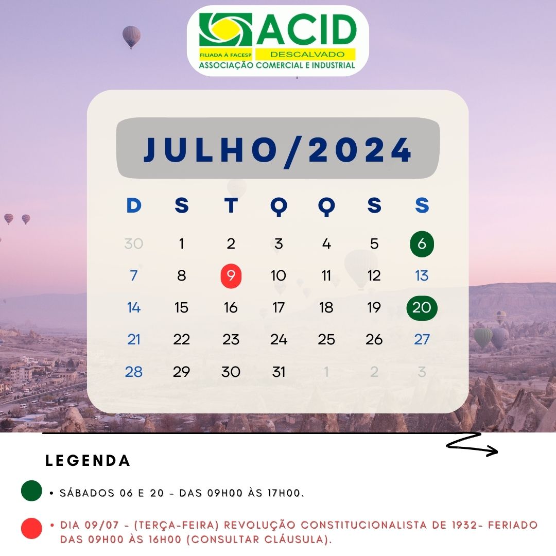 Conforme convenção coletiva junto ao sindicato, fica estabelecida os seguintes horários para JULHO de 2024